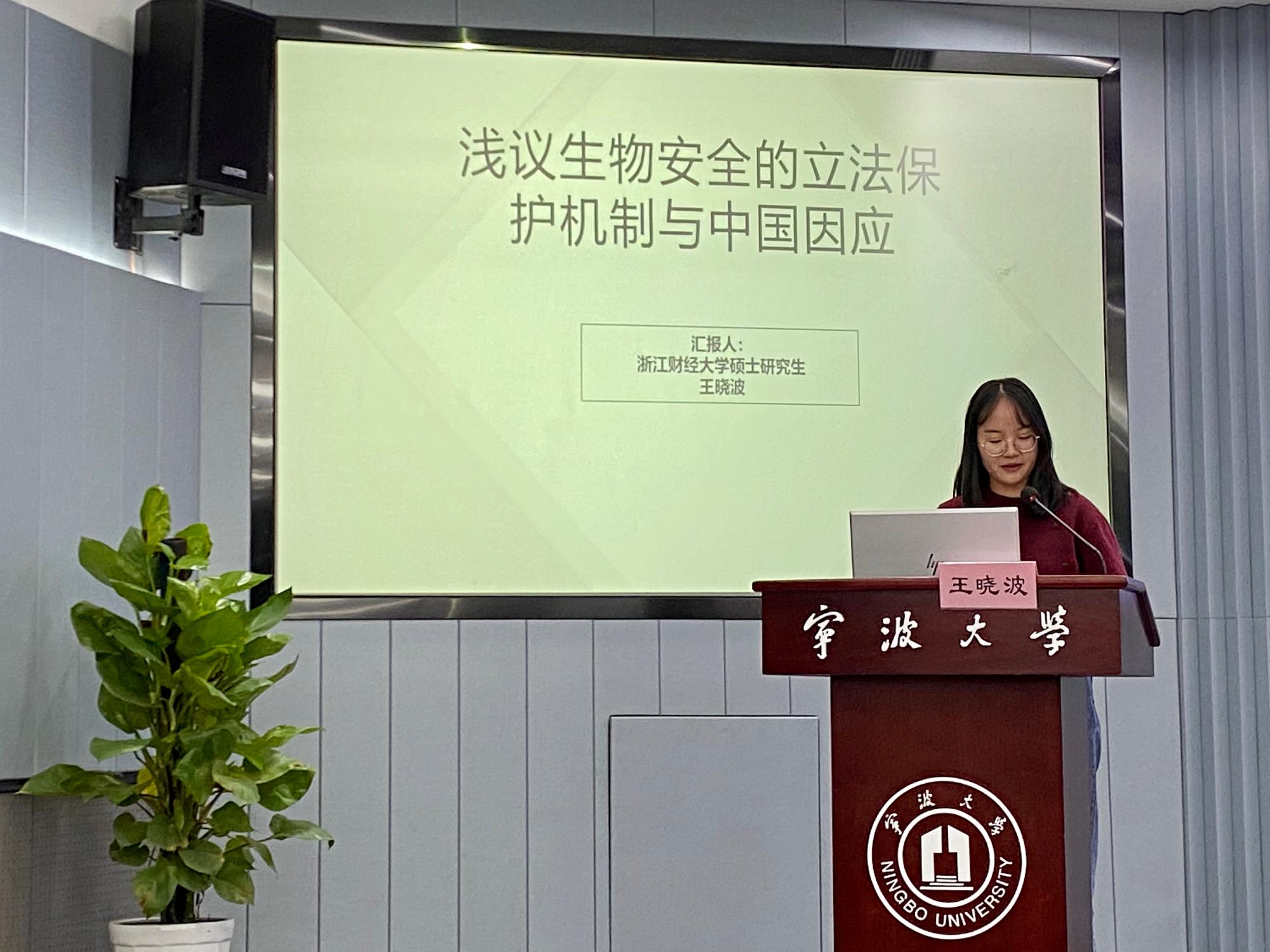 国际法学硕士研究生王晓波就生物安全问题作了题为“生物安全的立法保护机制与中国因应”的发言。发言指出在近年来生物恐怖主义、重大新发突发传染病疫情等生物安全问题的涌现、生物安全风险加剧的背景下完善国家生物安全治理体系与治理能力建设的重要性。在完善我国生物安全立法机制方面,应当在鼓励和推动生物技术研发创新的同时,加大信息公开和公众参与程度、完善重大突发疫情等生物安全问题的应急处置机制。